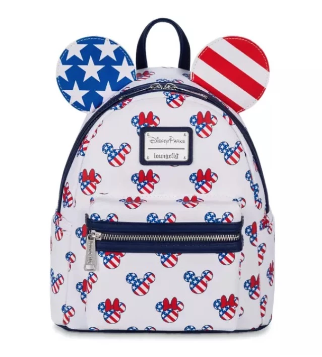 O say, can you see Mickey and Minnie icons on this star-spangled mini backpack from Loungefly? The allover print features the pair’s icons as American flags, whose broad stripes and bright stars cover the 3D ears of this simulated leather bag.